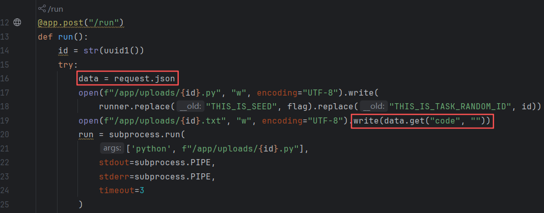 首先下载源码进行分析,可以看到存在路由/run且通过Json来传输数据