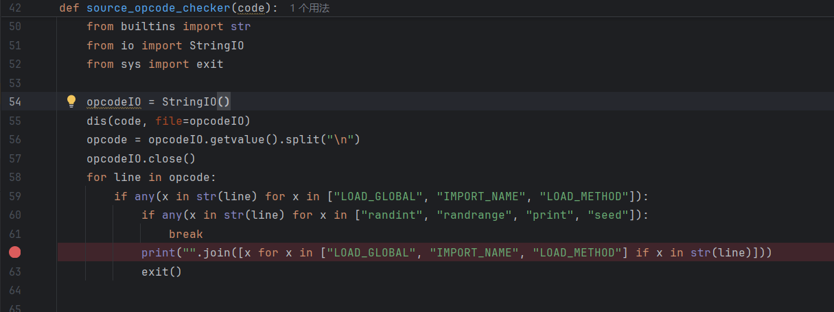 字节码检测 (source_opcode_checker): 检查代码编译后的字节码,禁止了LOAD_GLOBAL、IMPORT_NAME、LOAD_METHOD等操作码,但白名单允许randint、randrange、print、seed这几个函数的使用