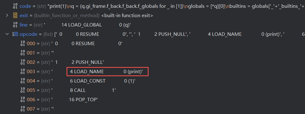 前面我们知道生成器反汇编之后有个LOAD_GLOBAL,那我们尝试在生成器里面引用print试试,开头改为(print for _ in [1]),重新下断点调试