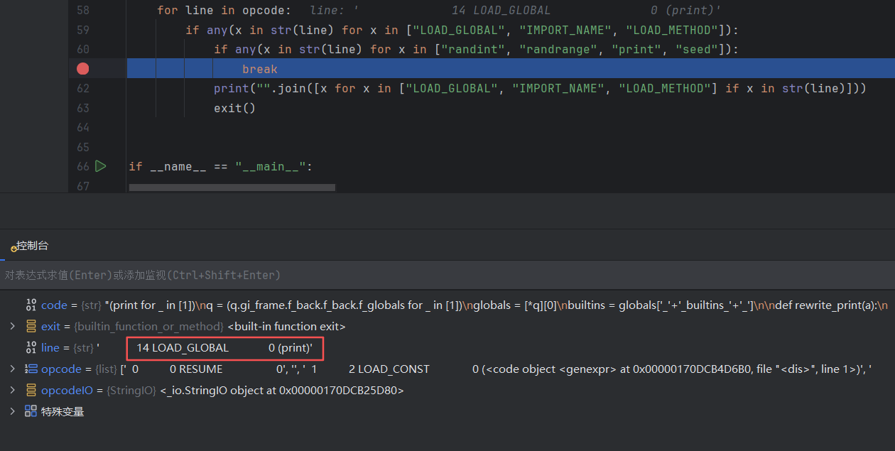 一开始我想通过在开头加个print(1)来触发break,但是试了一下发现返回LOAD_GLOBAL,也就是检测到了LOAD_GLOBAL但是没检测到print(1),导致exit