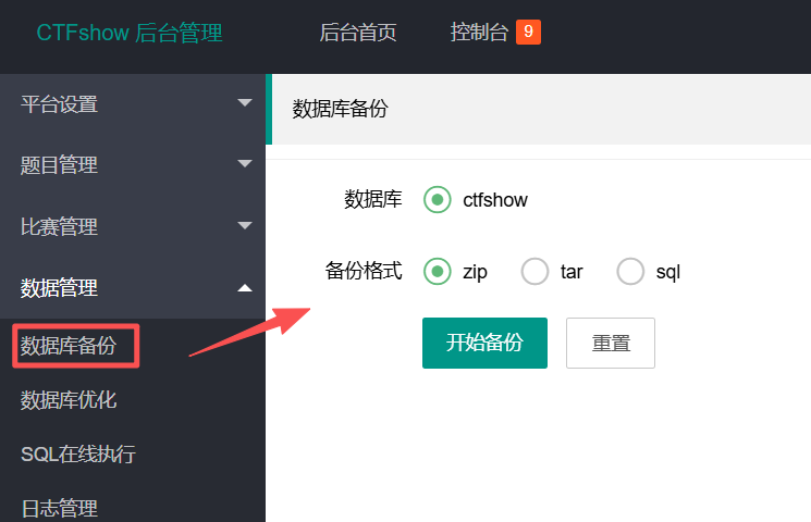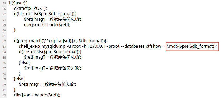 相比上题,这里的正则改成了preg_match('/^(zip|tar|sql)$/', $db_format),要求$db_format只能严格匹配 “zip”、”tar”、”sql” 这三个字符串,任何多余字符都不会通过,那我们换个方法,可以利用$pre进行变量覆盖然后分号截断执行命令