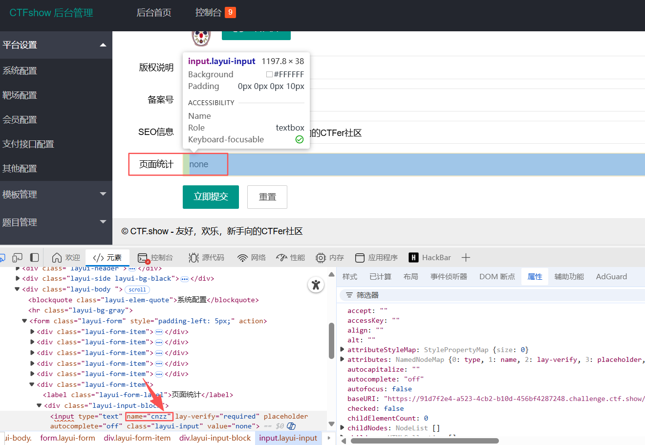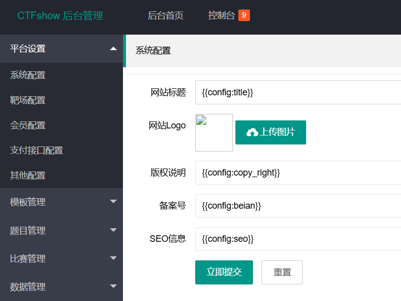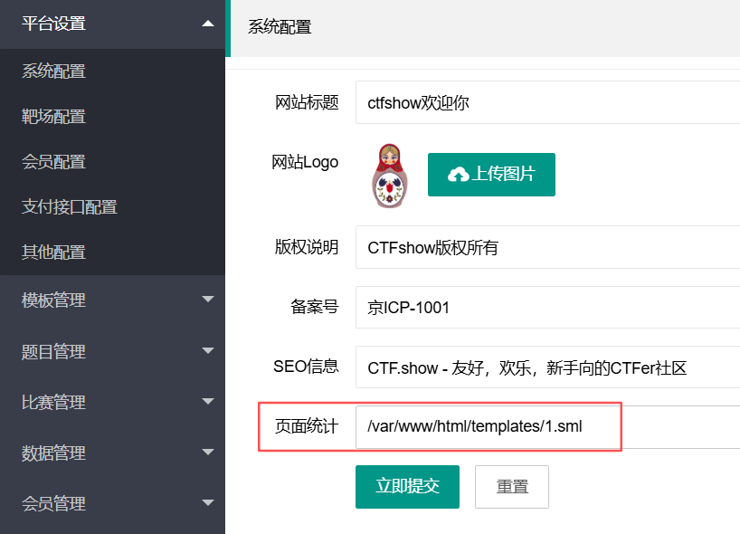 剩余的步骤跟上题一样,系统配置页面的页面统计写入地址/var/www/html/templates/1.sml,然后新增模板2.sml,内容1{{cnzz}},最后访问index.php?action=view&page=2执行命令即可