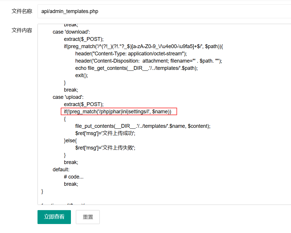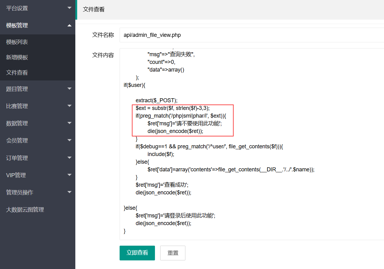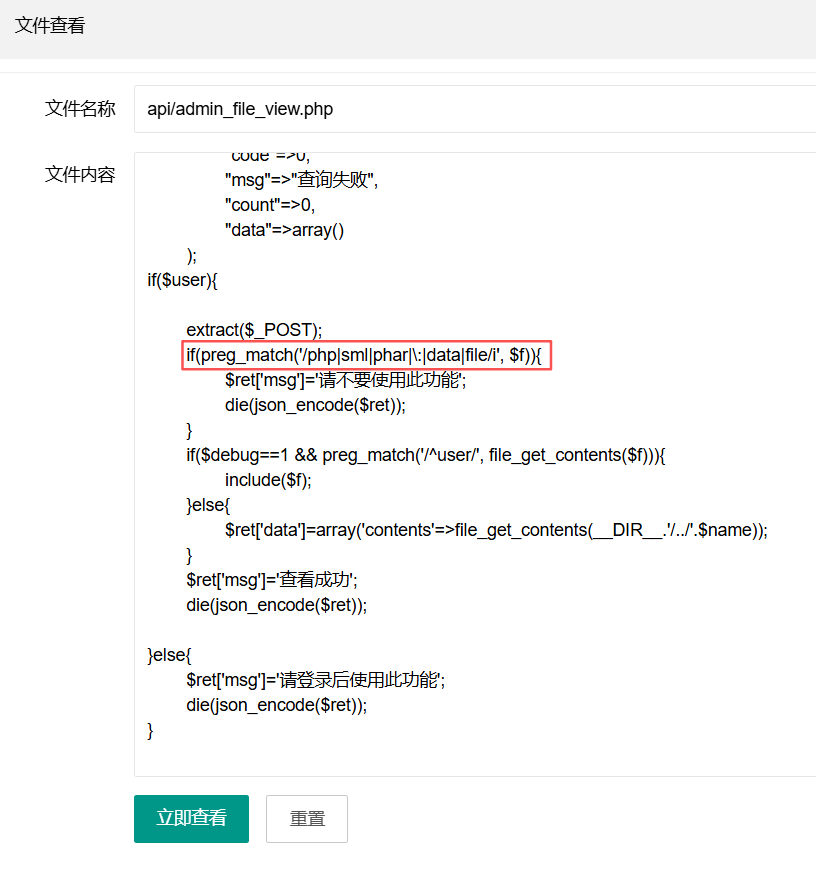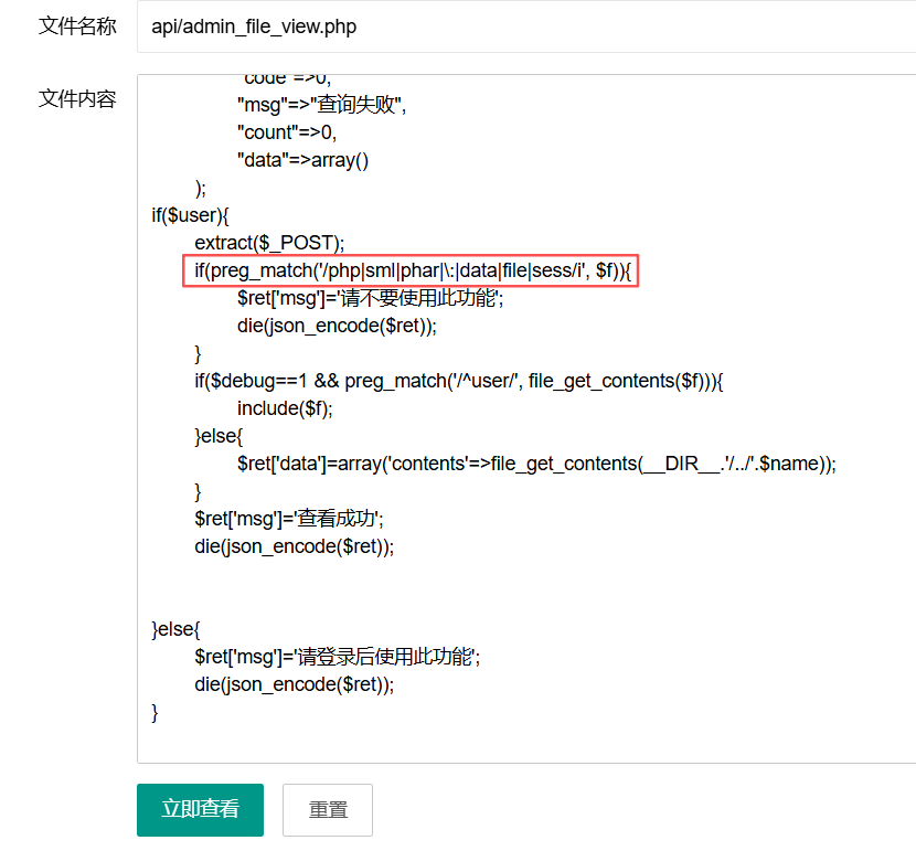 这题的api/admin_file_view.php相比上题,多了一个判断文件名后缀的代码,取 $f 文件名的最后三个字符,如果扩展名是 php、sml 或 phar(不区分大小写),则直接返回提示、终止流程