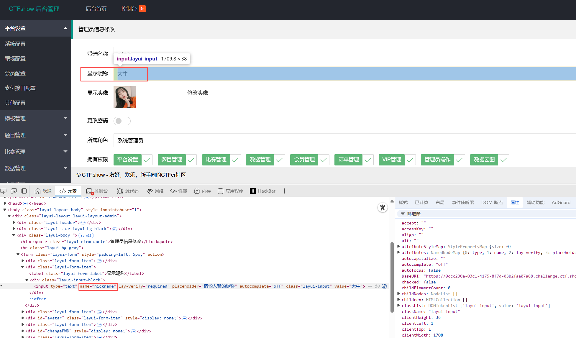 回到个人信息处查看源码,显示昵称对应的就是nickname,那我们可以用session文件包含来做这题
