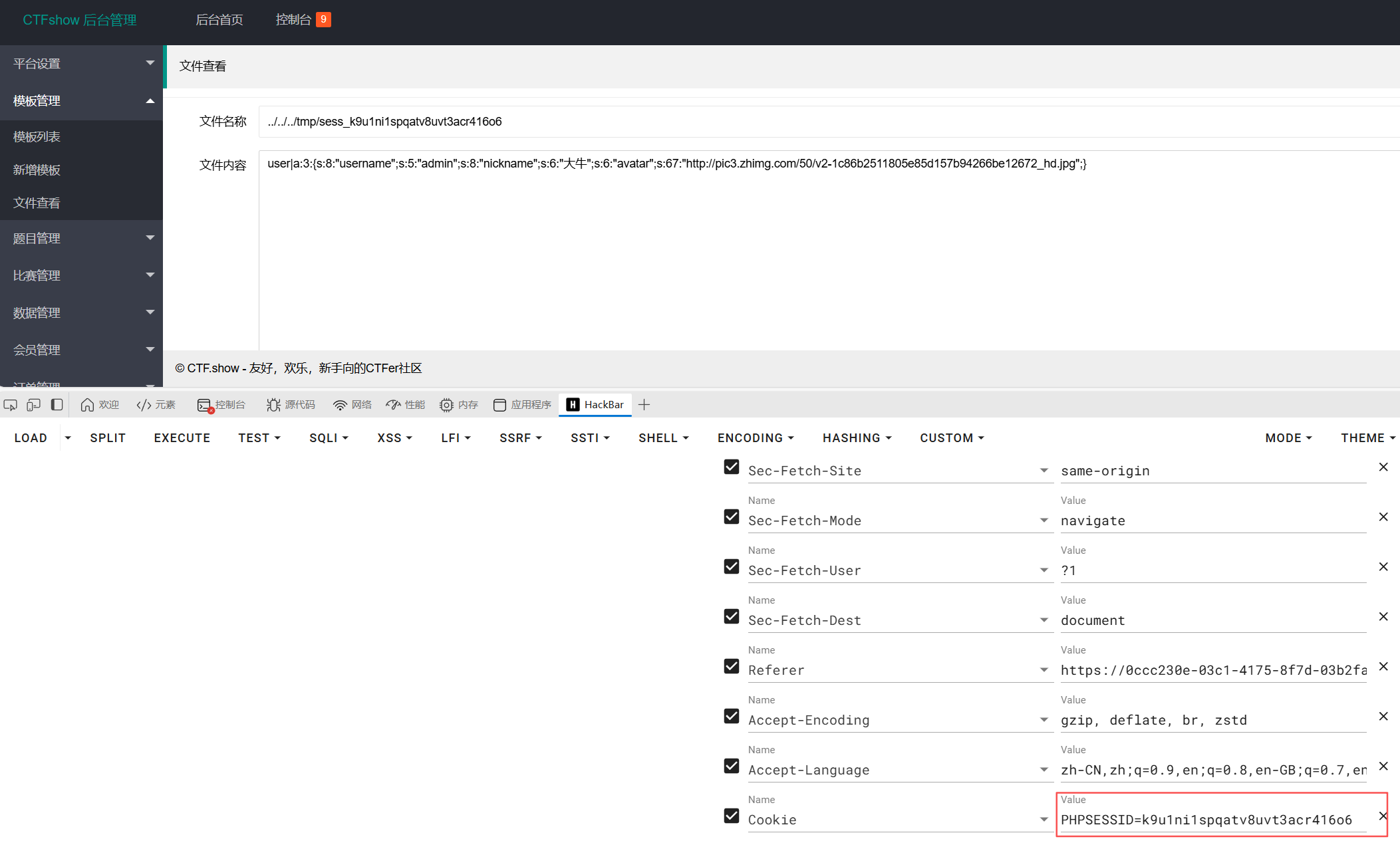 看看对应的session文件,在cookie复制PHPSESSID的值,然后拼接访问,如图