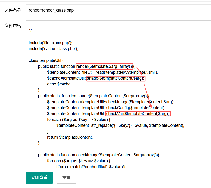 我们看看能不能利用,也是同一个文件,在上面可以看到shade函数调用了checkVar,然后render函数调用了shade
