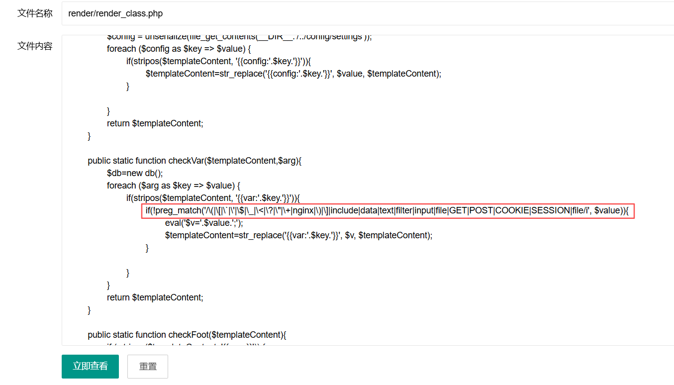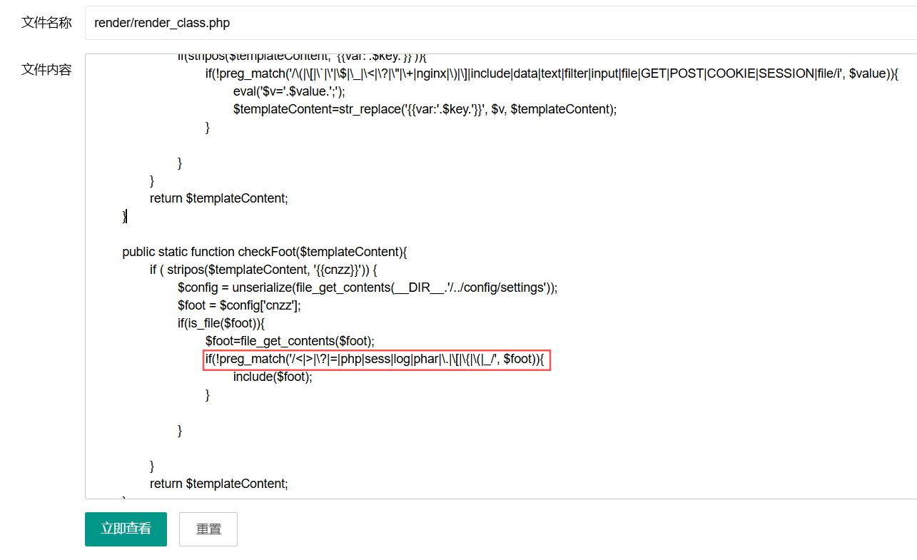 因为render/render_class.php有个$foot=file_get_contents($foot),然后再进行include操作,那我们可以在页面统计放入一个文件地址,然后这个文件的内容是另一个文件的地址,这样就可以进行文件包含