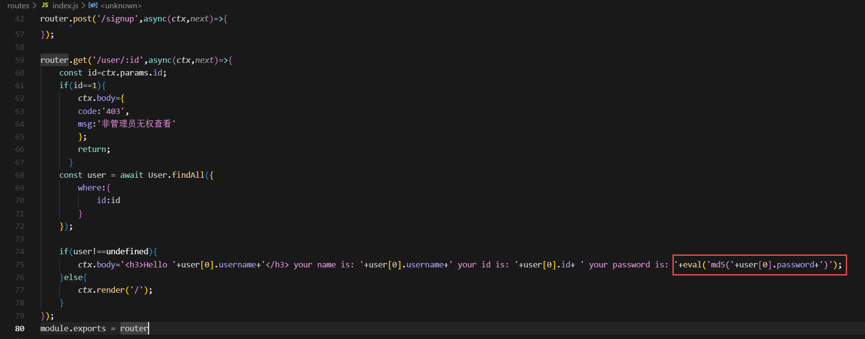 下载附件进行分析,其中关键代码为index.js里面的登录成功后显示处,会执行eval函数