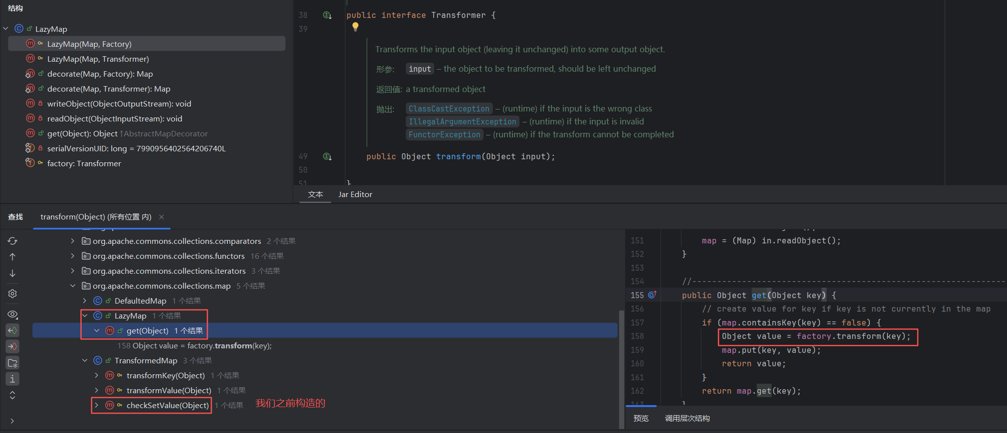 链子有一部分跟之前TransformedMap构造链一样,如果忘记了如何构造,可以看看文章:Java反序列化 CC1链分析