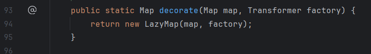 Map<Object, Object> map = new HashMap<>(); Map decorate = LazyMap.decorate(map, chainedTransformer);