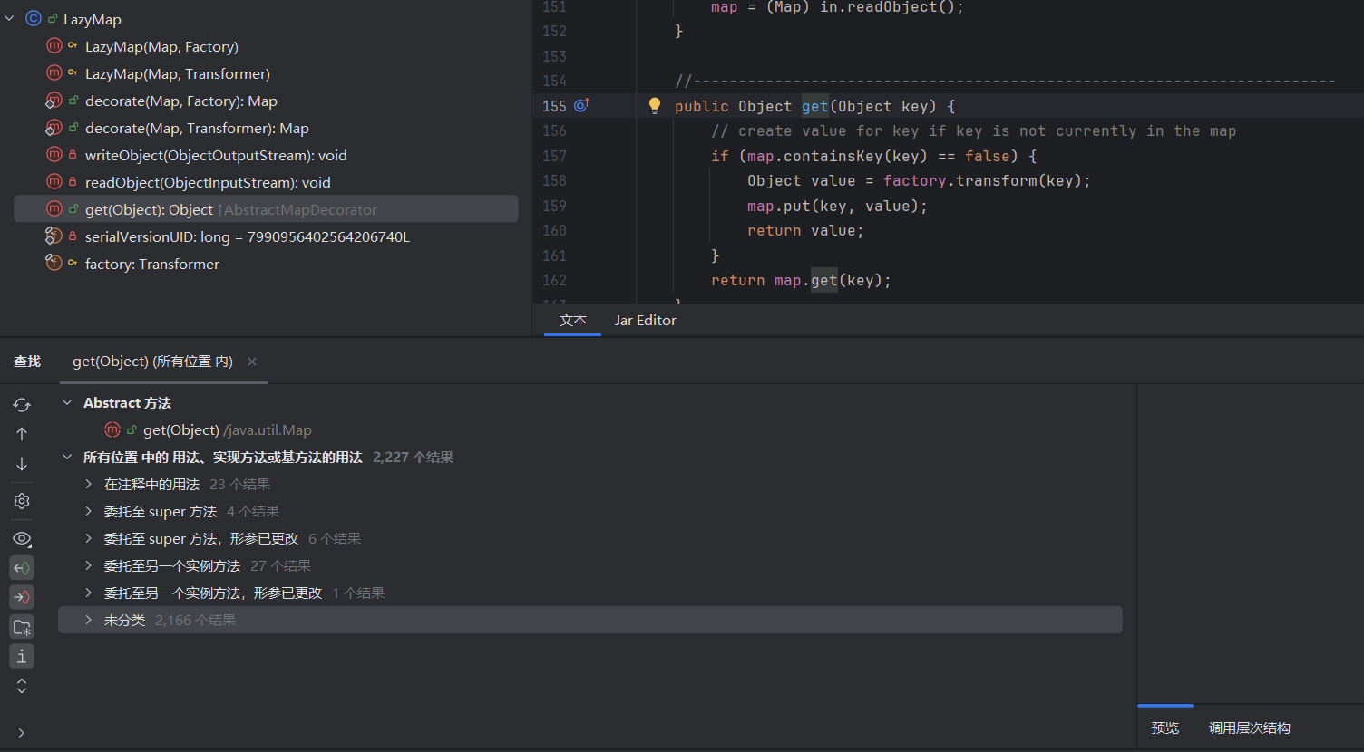 之前我们走的是TransformedMap.checkSetValue(),这次我们就不走这个了,走LazyMap的get方法