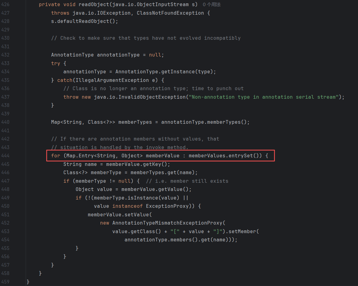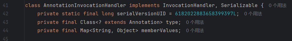 我们继续分析AnnotationInvocationHandler类,发现readObject方法里调用了无参方法,刚好这里还是反序列化的入口,一举两得