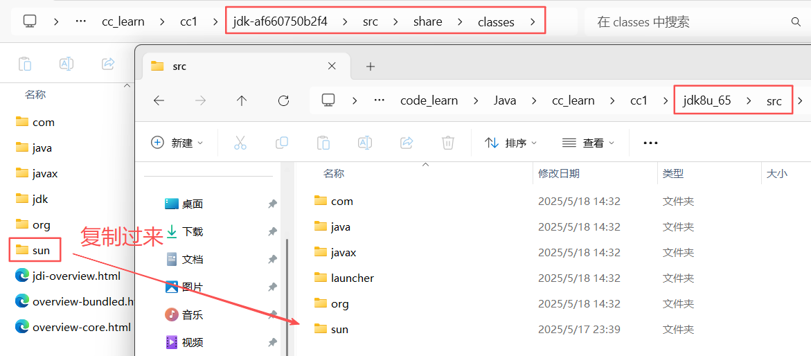 在我们之前安装的jdk8u_65文件夹中,找到src.zip的压缩包,解压到当前文件夹下,然后把jdk-af660750b2f4\src\share\classes里的sun文件夹复制到jdk8u_65文件夹中的src里面