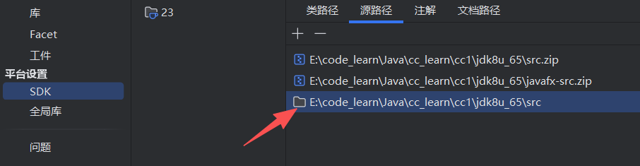 接着打开IDEA,在项目结构(Ctrl+Alt+Shift+S)里面找到SDK处,在源路径添加jdk8u_65的src文件夹,保存
