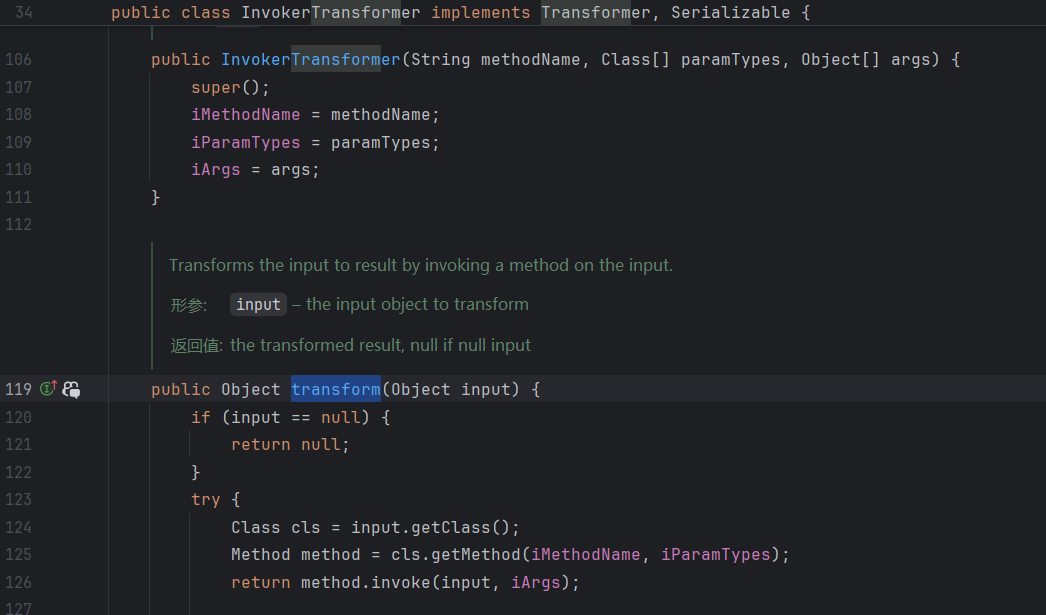 发现InvokerTransformer类继承了该接口,重写了transform方法,同时还继承了Serializable接口,符合我们的要求