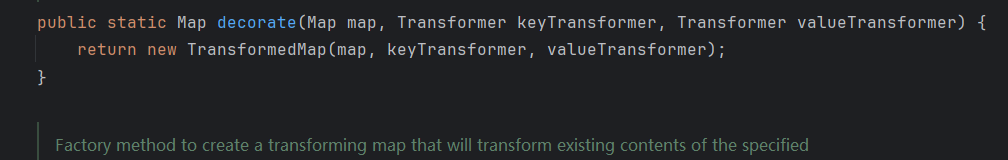 其中第一个参数为Map类型,我们可以传入HashMap,第二和第三个参数为Transformer类型,同样可控