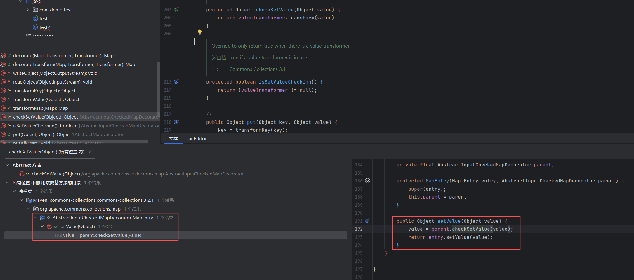 发现有且仅有一处调用了checkSetValue方法,类名为AbstractInputCheckedMapDecorator,然后TransformedMap类刚好又继承了AbstractInputCheckedMapDecorator类