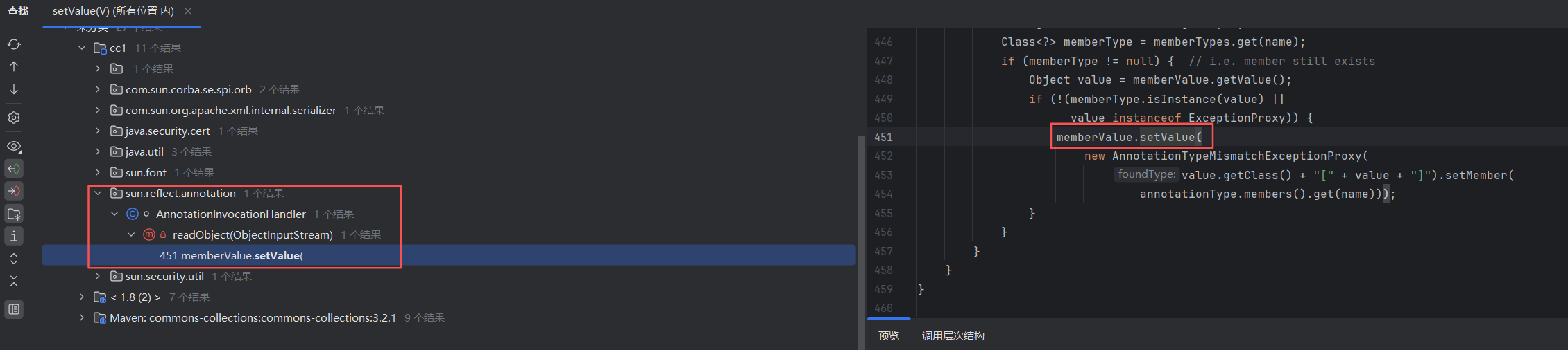 发现AnnotationInvocationHandler类的readObject方法调用了setValue,刚好满足我们的要求,也寻到了入口,一举两得