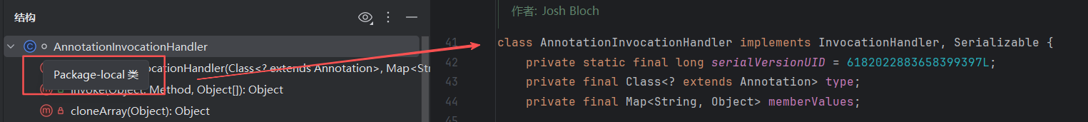 再看看AnnotationInvocationHandler的访问权限,发现并没有Public等访问修饰符,则默认表示Package-local方法,即只能在同一个包下访问,在包外的类中是不可见的,无法调用