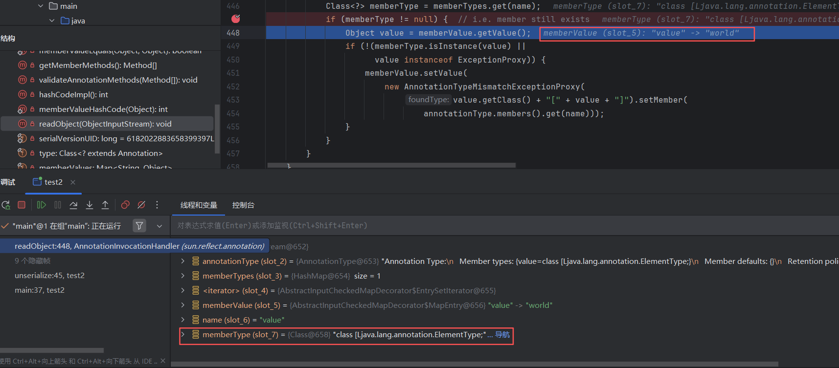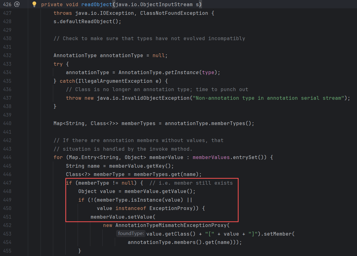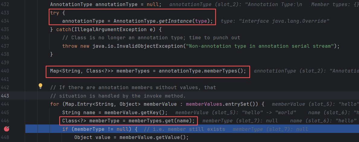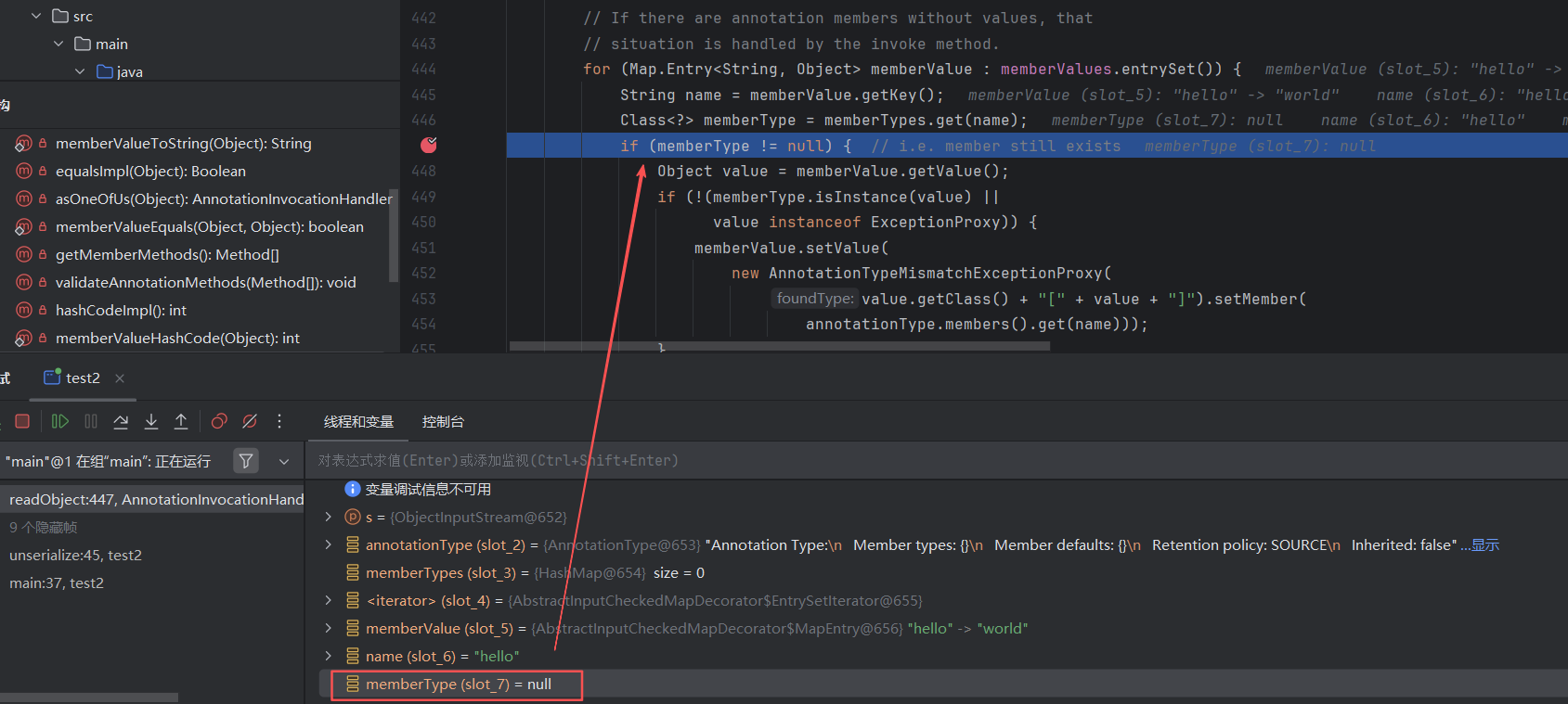 首先在AnnotationInvocationHandler类的readObject方法的第一个if判断语句处打断点,调试后可以看到memberType值为null,无法进入if语句