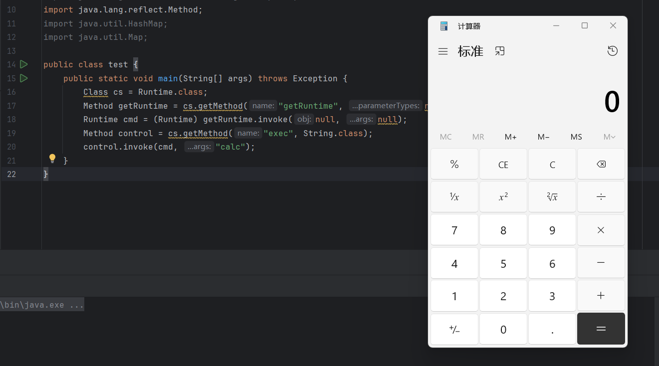 | Class cs = Runtime.class; Method getRuntime = cs.getMethod("getRuntime", null); Runtime cmd = (Runtime) getRuntime.invoke(null, null); Method control = cs.getMethod("exec", String.class); control.invoke(cmd, "calc");