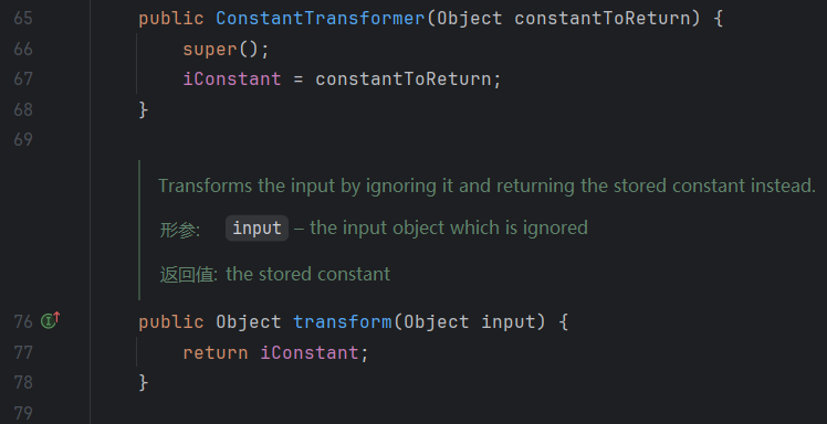 最后就是解决readObject()调用的setValue()参数不可控,继续分析代码,发现ConstantTransformer类刚好满足我们的要求,它重写后的transform可以返回我们传入的对象